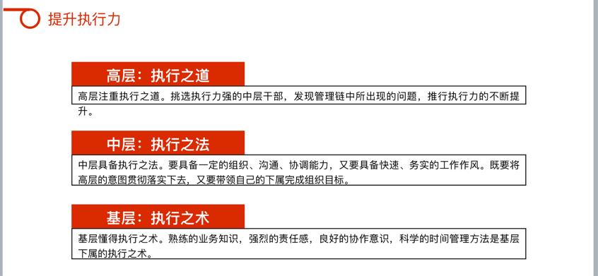 生動形象地幫助大家建立了對執(zhí)行力的結(jié)構(gòu)化認(rèn)知,更進(jìn)一步理解到了工作態(tài)度、工作職責(zé)、工作任務(wù)、工作結(jié)果的邏輯聯(lián)系,以及如何在強(qiáng)化執(zhí)行力的同時,提高部門運作效率,使效能與效率相輔相成,創(chuàng)造出更高的部門績效。